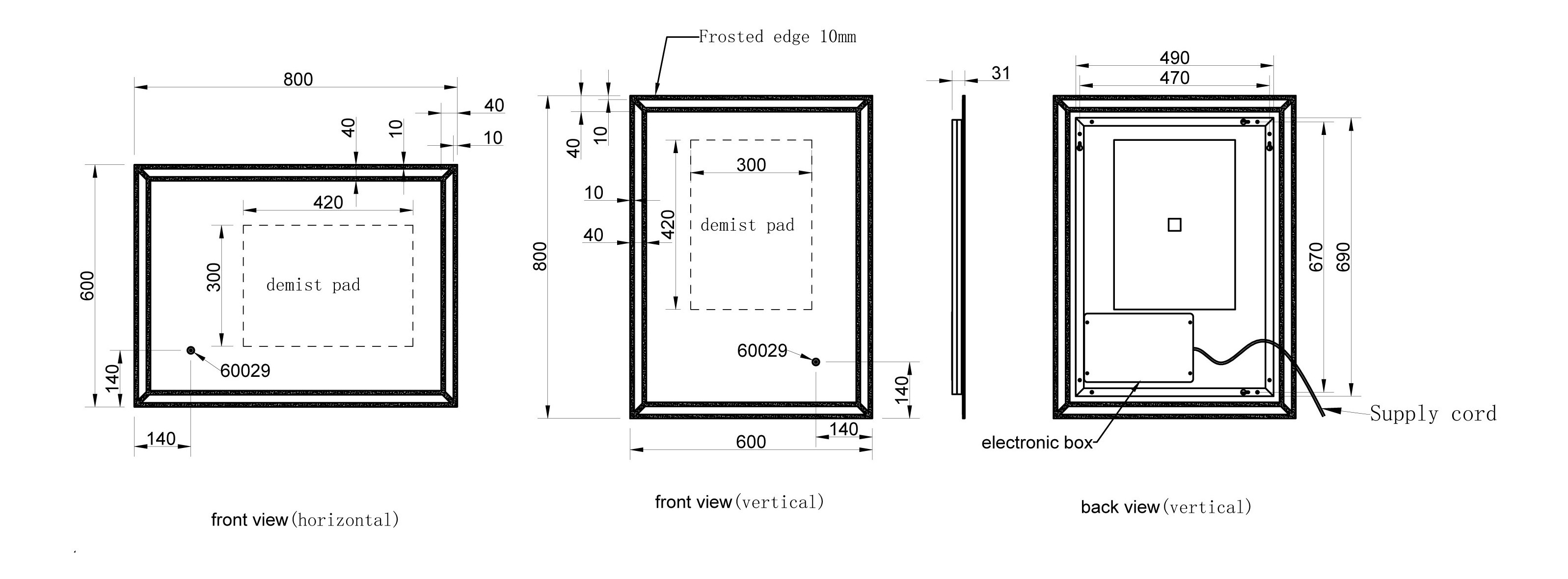 June 600x800mm Rectangular LED Mirror led light: yes front lit led ip44 rated light colour: 6000k - 3000k integrated demister pad : yes demister pad : 420mm x 300mm dimmable light : no touch sensor: yes